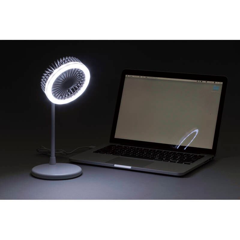 USB電源使用の小型扇風機付LED電気スタンドです。・扇風機速度(3段階)・ライト明るさ(無段階調光式)